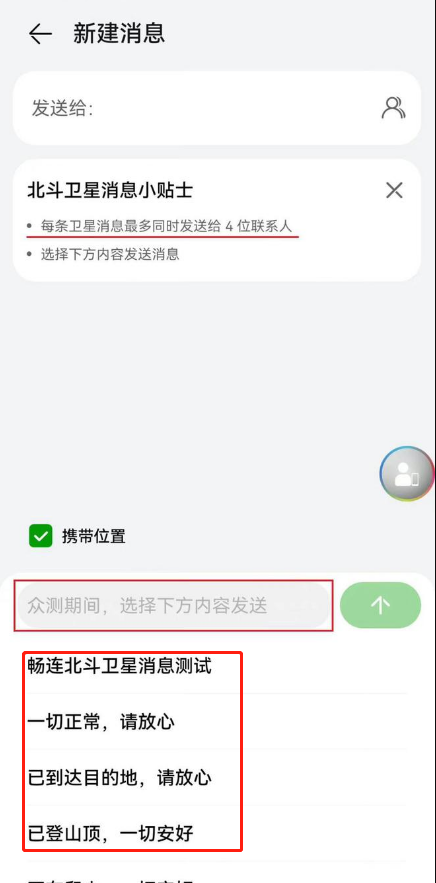 1、打开华为mate50后,找到北斗卫星的新建消息。(注意一条消息可以同时发送给4位联系人)