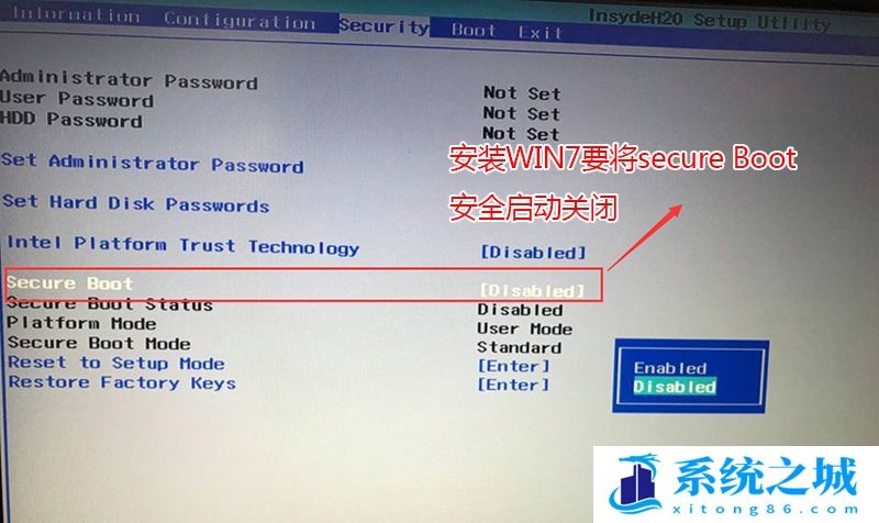 1、开机一直按F2或(FN+F2)进入BIOS,按→方向键切换到Security选择Secure Boot回车设置成Disabled,关闭安全启动,这里一定要记得关闭,如下图所示;