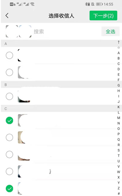4、在选择人的界面中,只需要点击每个人的微信就可以选中群发,点击选中想要群发的好友后,点击右上角的【下一步】。