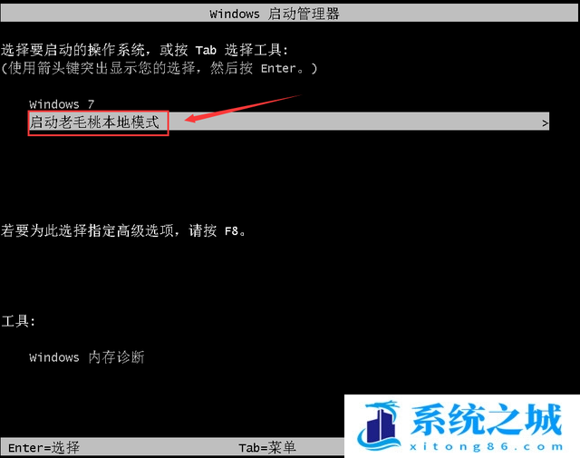 重启计算机,自动进入windows启动管理器后,通过键盘↑↓选择启动本地模式,即可进入PE系统。