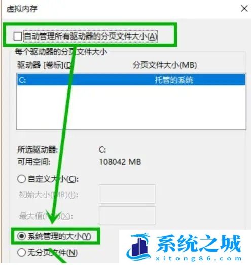 14、在打开的【虚拟内存】窗口,取消【自动管理】前面的选中状态,然后选择【系统管理的大小】,然后点击【确定】,然后重启就行了。之后电脑就不会出现蓝屏错误代码PAGE_FAULT_IN_NONPAGED_AREA了。