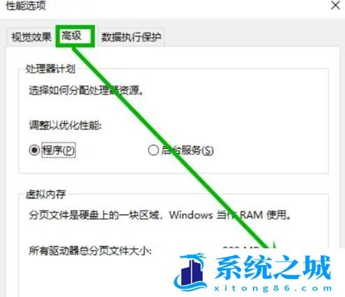 13、在打开的【性能选项】界面,选择【高级】选项卡,然后点击【虚拟内存】组的【更改】选项。