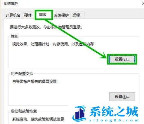 12、在打开的【计算机属性】窗口,选择【高级】选项卡,然后点击【性能】组的【设置】选项。
