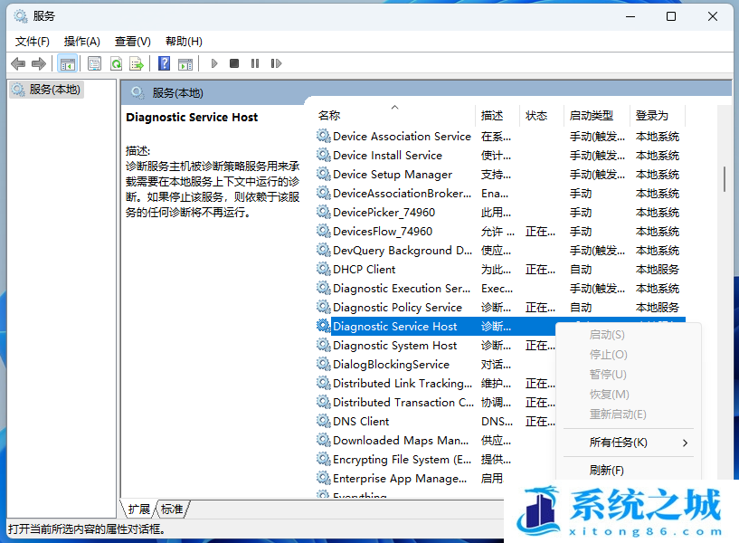 8、最后,再返回到服务,找到名称为【Diagnostic System Host】的服务,然后点击【右键】,在打开的菜单项中,选择【属性】;