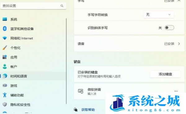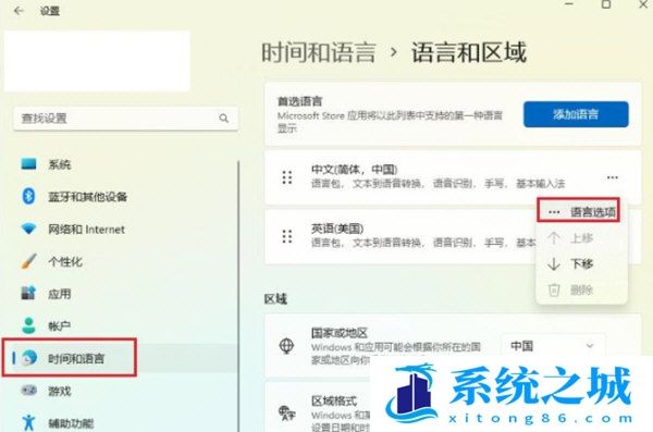2、选择时间和语言,点击中文后面的三个点击,选择语言选项。