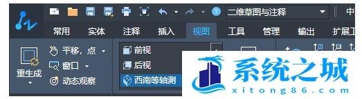 4、点击视图-西南等轴测按钮,将视图切换到西南等轴测模式。