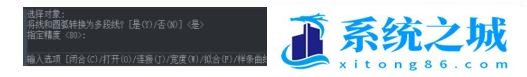 2、在命令行中输入PE指令,合并这些直线与曲线,使它们成为一段完整的曲线,按下回车键确认。根据命令行出现的指示再输入M指令,选择所有对象,按下回车键。在是否将线和圆弧转换为多段线的提示下输入Y,按下回车键。选择精度值,按下回车键确认。