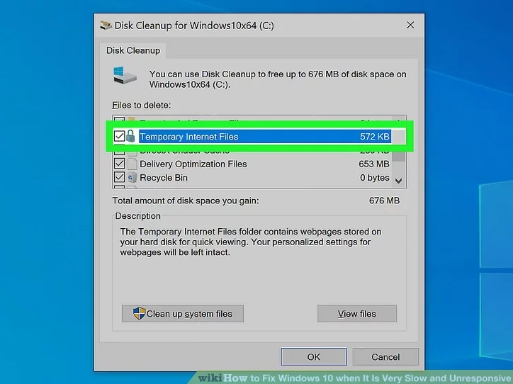 3、单击以选中“Internet 临时文件”和“临时文件”旁边的复选框。您将看到它们将在列的右侧释放多少空间。最后,点击OK。该框将消失,您会看到删除的进度条,完成后会消失。