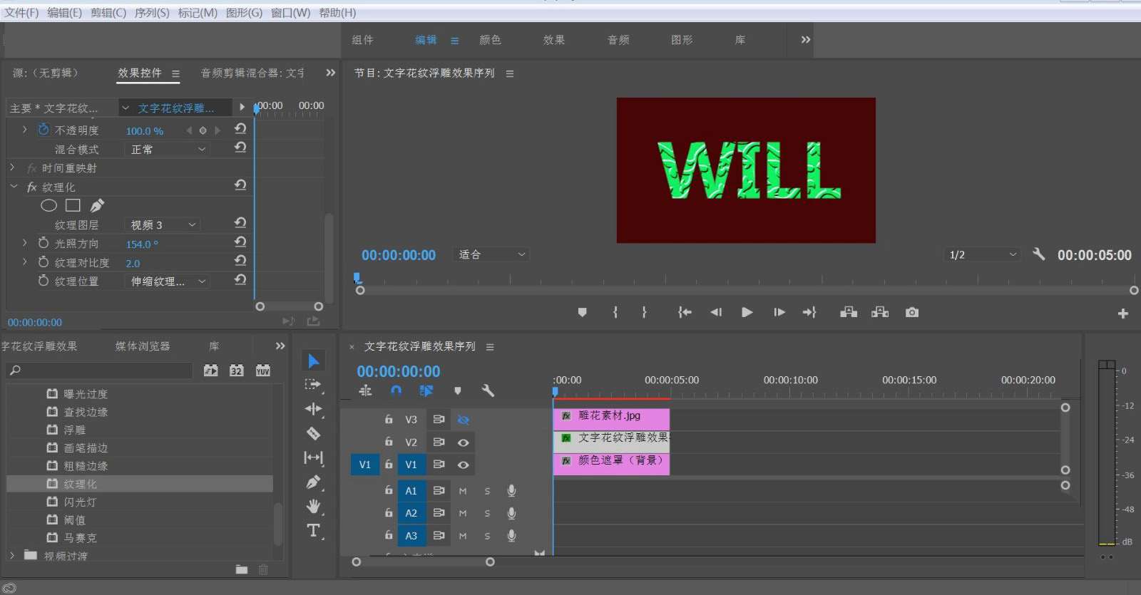 4.然后选中字幕素材,在效果控件中添加纹理化效果