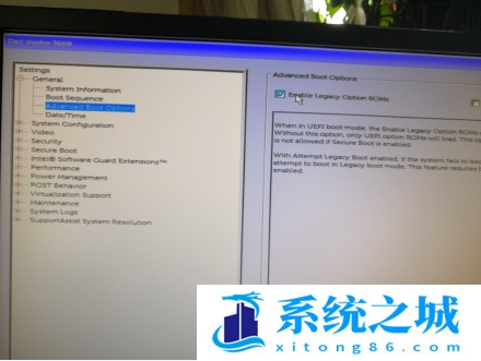 4、将General选项下面的 Advanced Boot Option中的Enable Legacy Option ROMS勾选上,界面如下: