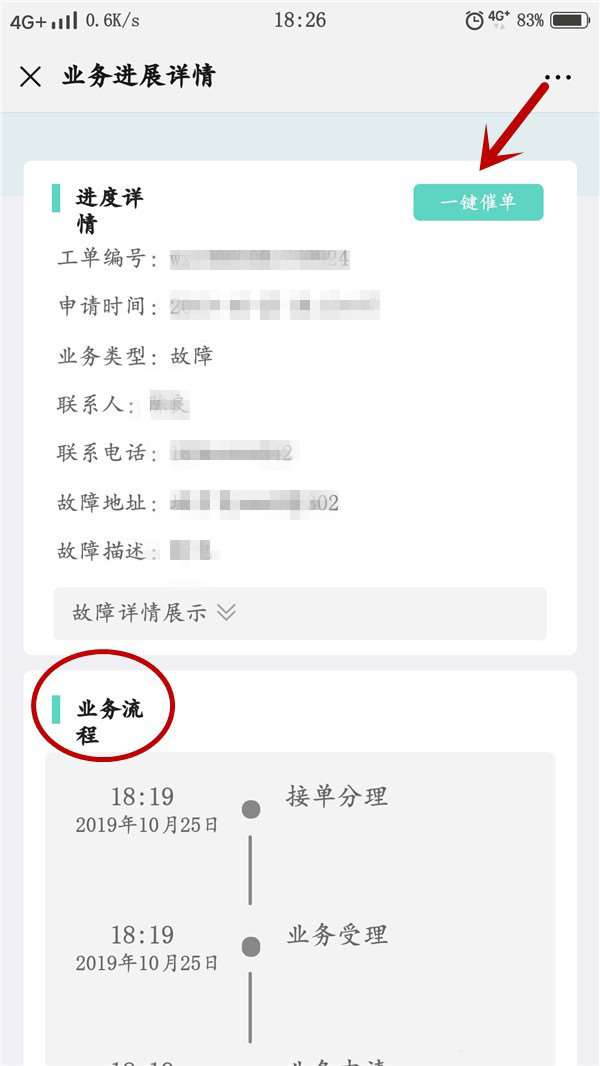 12,进入到业务进展详情页面,可以查看到业务流程,如果没有受理可以点击【一键催单】。