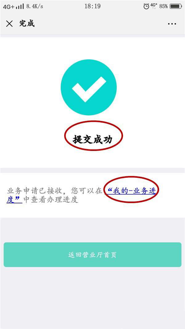 8,系统提示:提交成功,可以在“我的--业务进度“中查询。