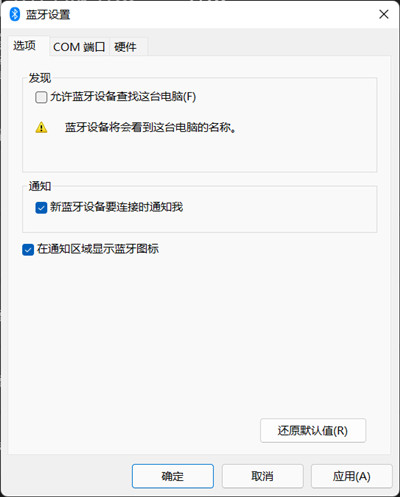 3. 将“允许蓝牙设备查找这台电脑”取消勾选