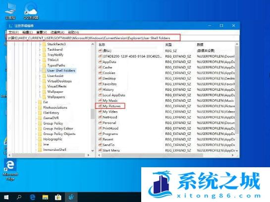 2、进入注册表编辑器,将“HKEY_CURRENT-USERSoftwareMicrosoftWindowsCurrentVersionExplorerUserShell Folders”复制到上方地址栏中,并回车定位到此,接着在右侧中找到“My Picture”双击打开。
