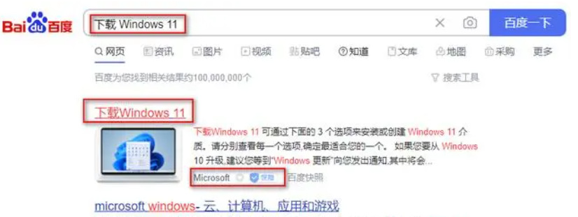 1.百度搜索输入:"下载 windows 11",点击搜索结果,进入微软官网下载界面。