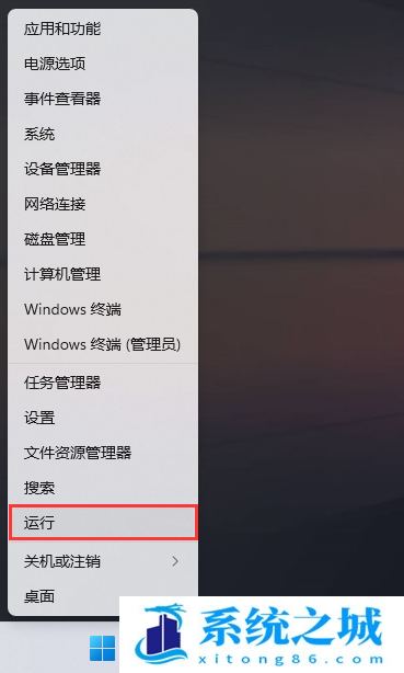 1、首先,按键盘上的【 Win + X 】组合键,或右键点击任务栏上的【Windows开始徽标】,在打开的隐藏菜单项中,选择【运行】;