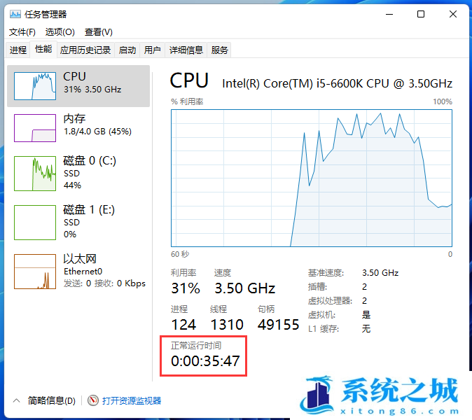 2、任务管理器窗口中,切换到性能选项卡,然后点击CPU选项,在页面底部右侧即可查看到当前系统正常运行时间;