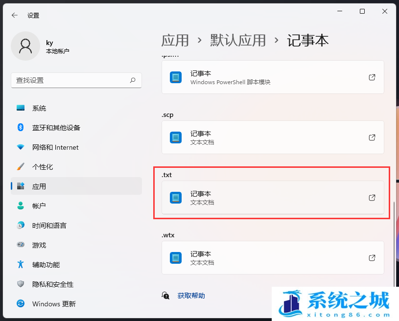 4、找到并查看后缀名为 .txt 的默认打开应用是否为记事本,如果不是,则需要重新选择;
