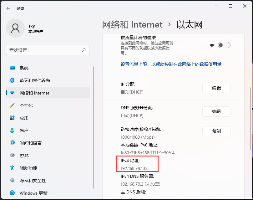3、当前路径为:网络和 Internet>以太网,然后就可以查看到【IPv4 地址】了。