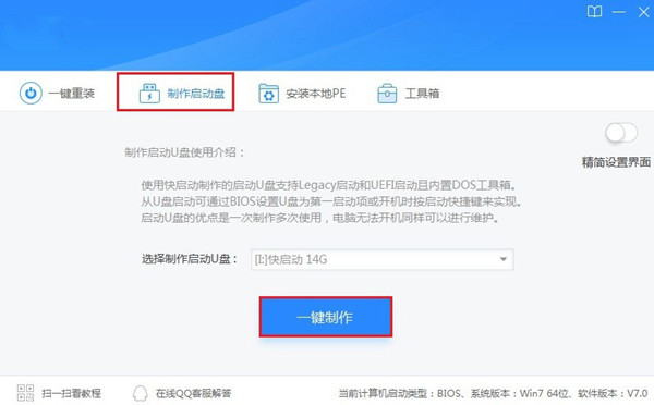 选择制作启动盘,插入U盘,备份U盘个人重要文件,因为制作工程中会删除U盘上的所有数据,点击“一键制作”