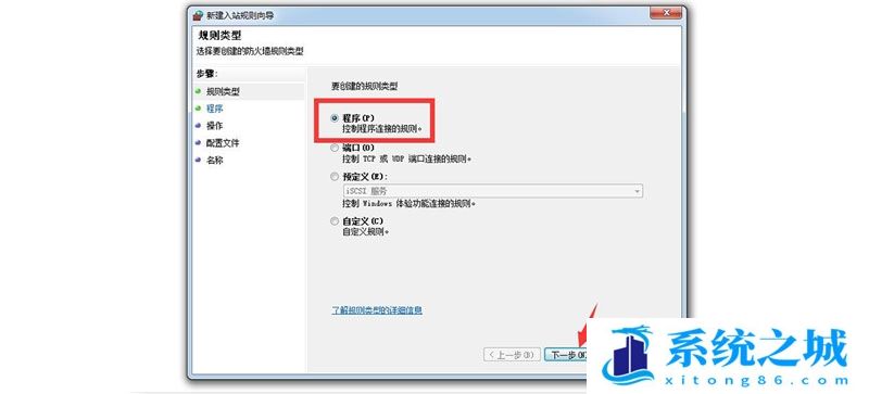 7、进入【入站规则】的新建向导后,选择【程序】再点击【下一步】。