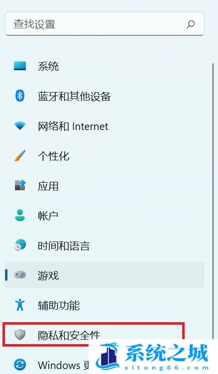 3、设置窗口,左侧点击进入隐私和安全性选项