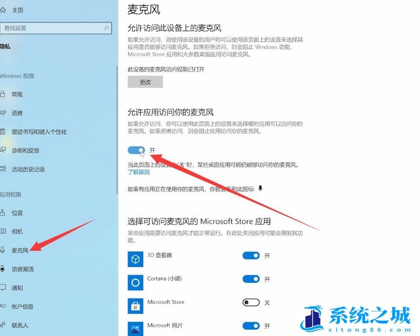 4、隐私和安全性 - 麦克风,找到麦克风访问权限和让应用访问麦克风,然后滑动滑块,将其打开;