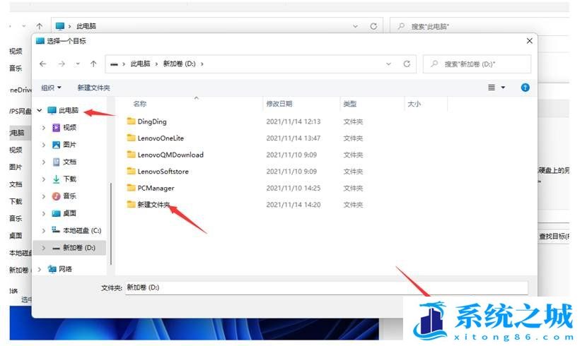 3、在弹出的选择一个目标窗口,点击左侧的此电脑,然后选择一个非系统盘中的文件夹,如果想将Win11桌面路径更改为非系统的其它盘,一定先要在其它盘里面新建一个文件夹,不能直接选择其它盘的根目录,否则会导致其它盘的文件直接到桌面上,以及无法还原成默认桌面文件路径;