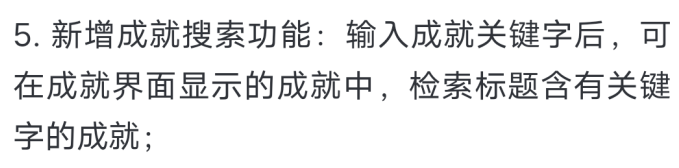 小编点评:成就搜索功能只能搜索非隐藏成就与已完成的成就,而未完成的隐藏成就无法搜索,目前看来用处不大,可以作为排查成就完成情况核对时的工具,来检索是否完成该成就