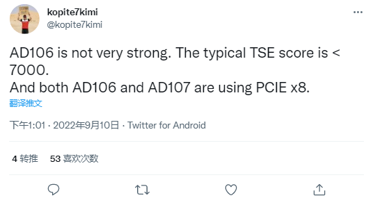 在最新的推文中,@Kopite7kimi 表示英伟达在中端显卡这方面刀法依然有着足够的水准,NVIDIA GeForce RTX 4060 显卡可能没有大家对 RTX 40 系列期望的那般强,并且依然会使用 PCIe x8 接口。他表示,这应该是因为 RTX 4060 系列显卡搭载的 NVIDIA AD106 GPU 性能不是很强。