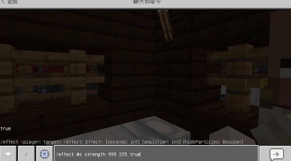 1.首先我们进入游戏聊天框,输入/effect @s strength 999 225 true这条指令。