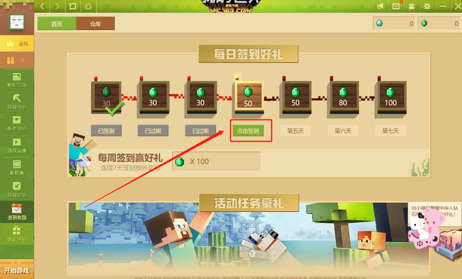 然后可以看到在首页有每日签到好礼,点击下面的点击签到。