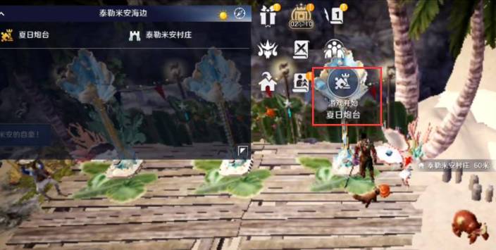 四、在泰勒米安村庄小地图左上角点击夏日炮台,根据提示即可找到夏日炮台,如下图所示。